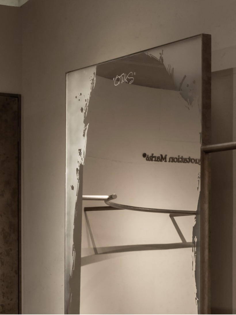 設(shè)計(jì)師將街頭文化融入鏡子,親自手繪的板刷筆觸在鏡子的邊緣演繹,其四周以刷子痕跡去除部分水銀,巧妙地融入了街頭工業(yè)的粗獷感,是普通鏡子的別樣演繹。